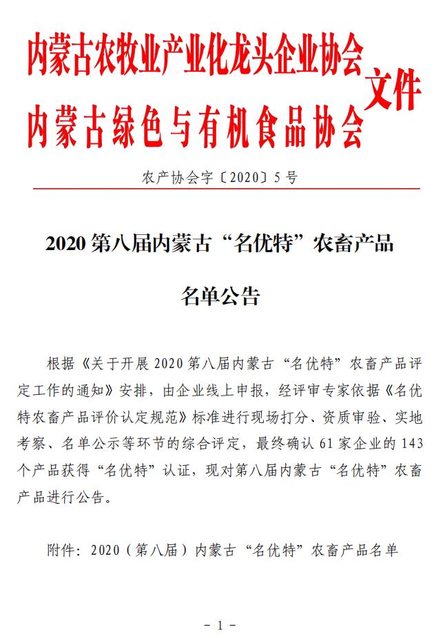 標題:2020第八屆內蒙古“名優(yōu)特”農畜產品名單公告
